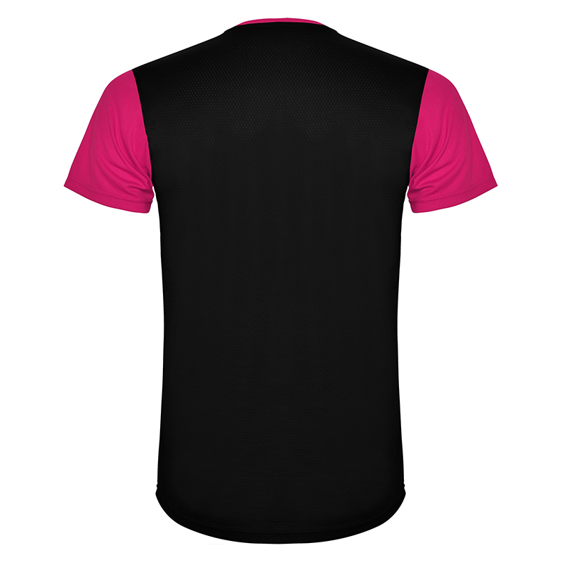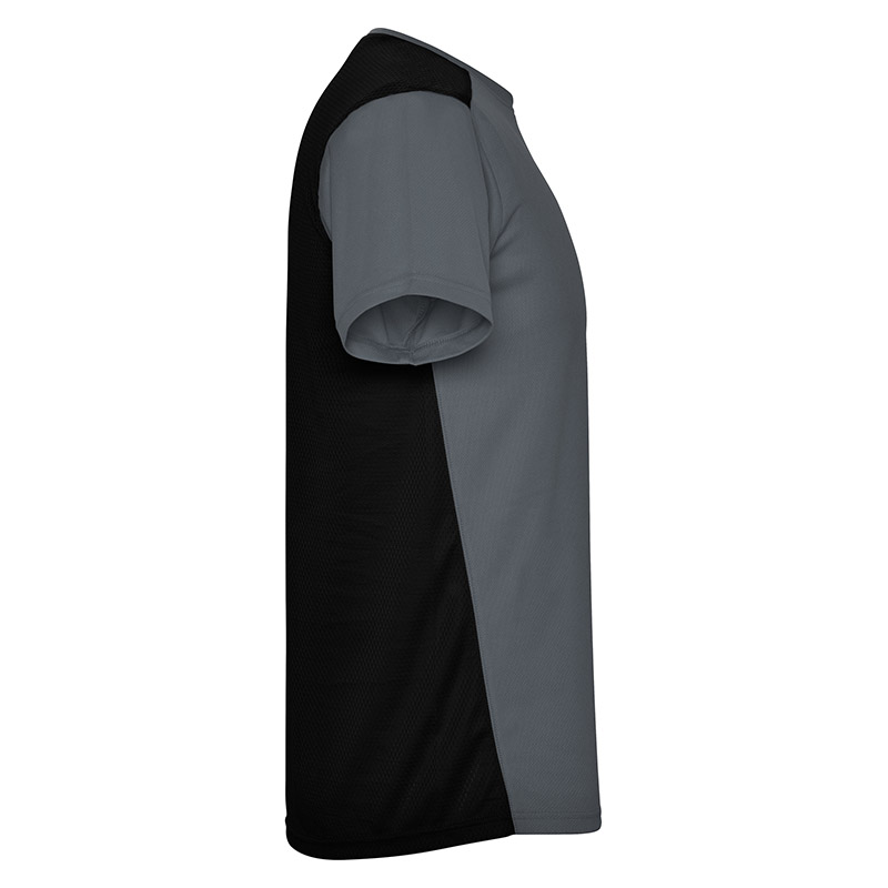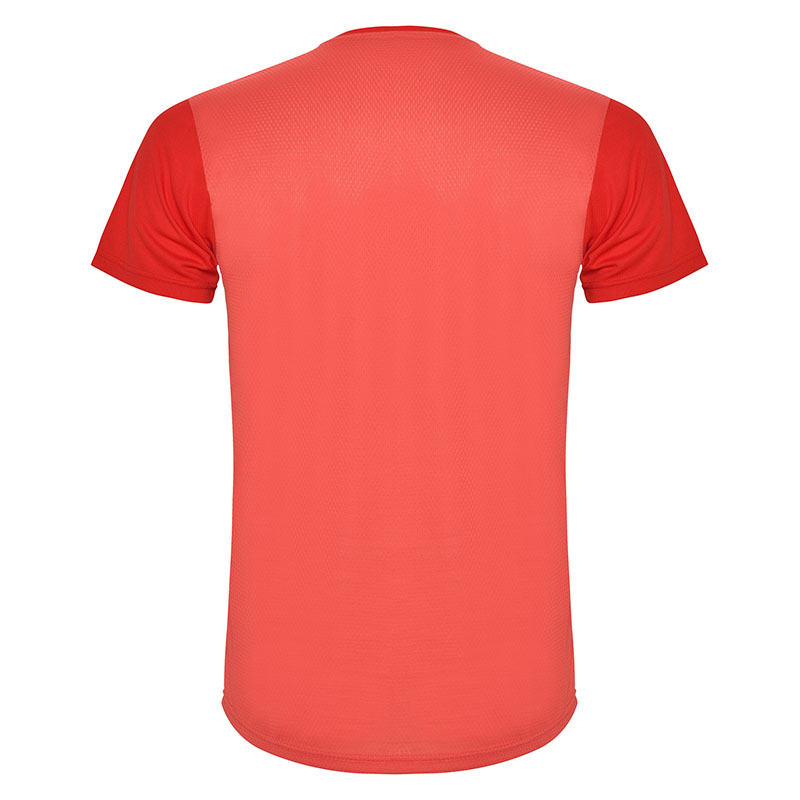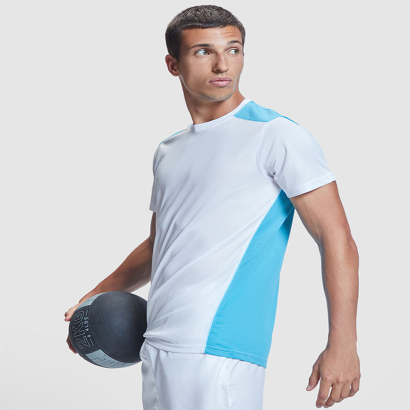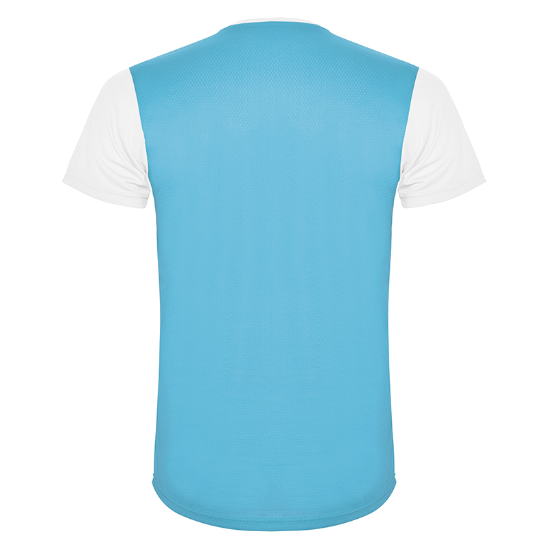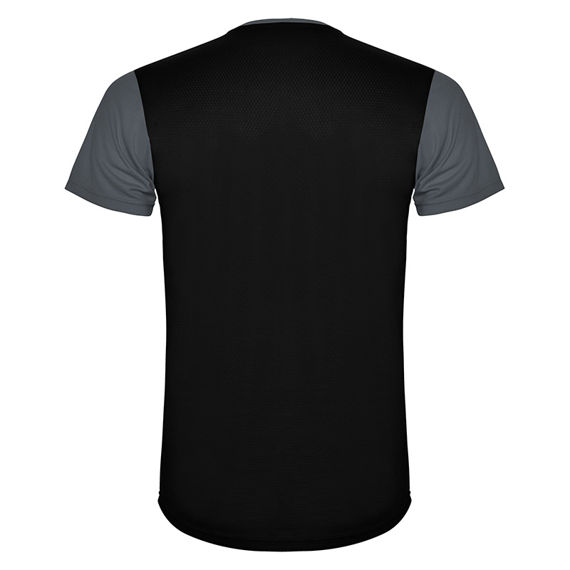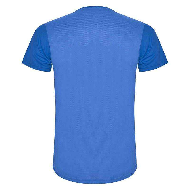 Camiseta técnica de manga corta, con cuello redondo. Combinada en espalda y hombros con dos tejidos de poliéster. Tejido principal frontal bird´s eye y tejido rejilla 3D transpirable en la parte trasera. Tejido preparado para la absorción de humedad. Pespuntes decorativos zigzag en hombros y costados frontales. Patronaje en la espalda ligeramente mas largo.