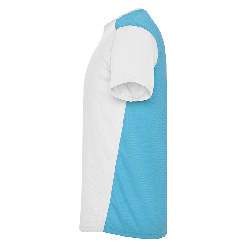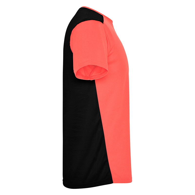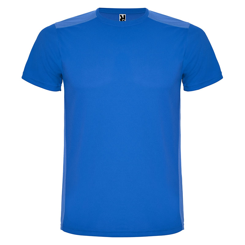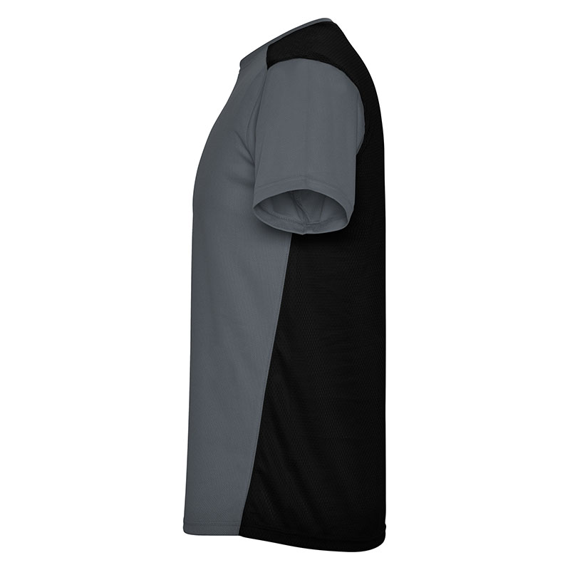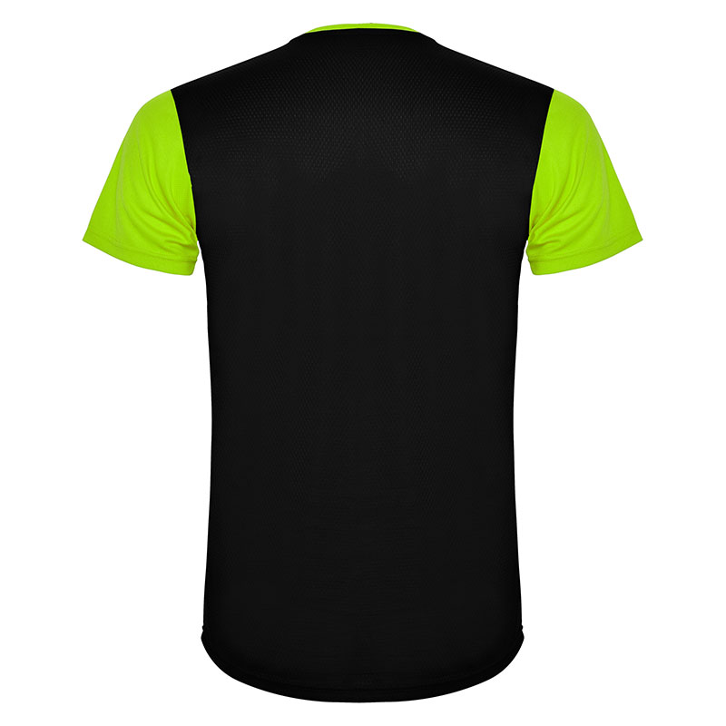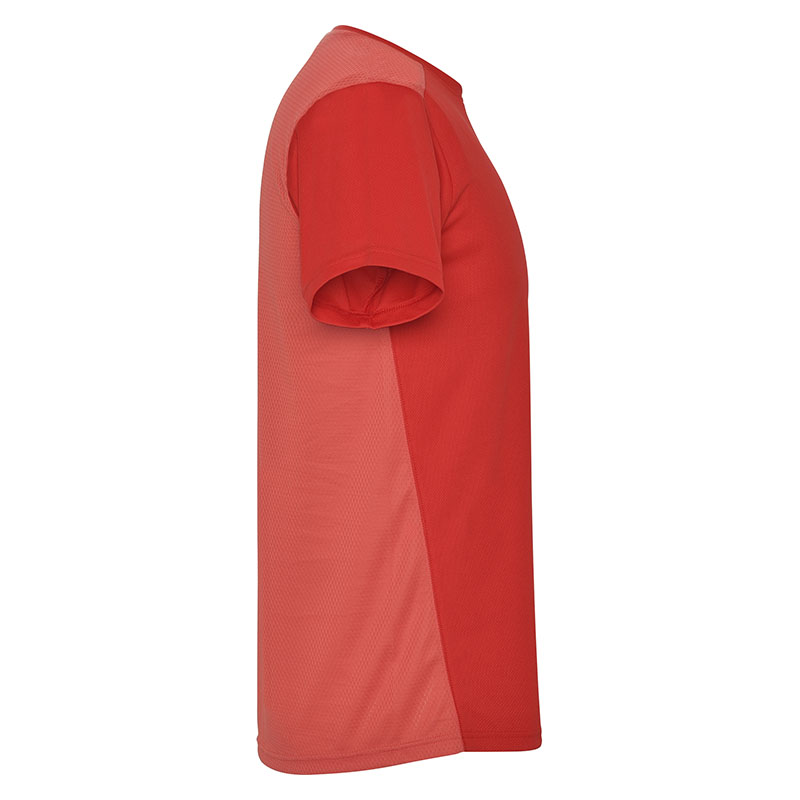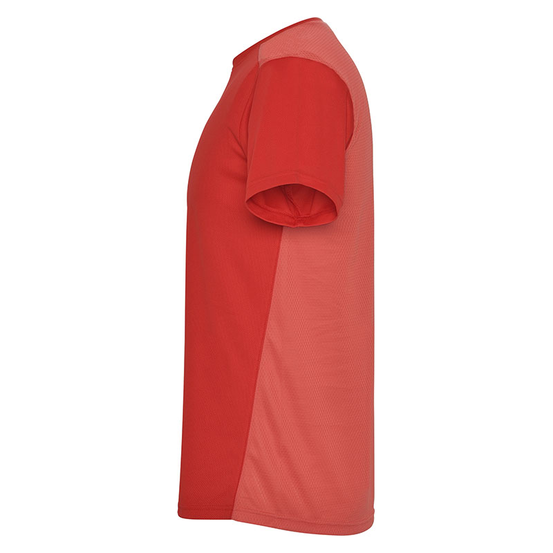 Camiseta técnica de manga corta, con cuello redondo. Combinada en espalda y hombros con dos tejidos de poliéster. Tejido principal frontal bird´s eye y tejido rejilla 3D transpirable en la parte trasera. Tejido preparado para la absorción de humedad. Pespuntes decorativos zigzag en hombros y costados frontales. Patronaje en la espalda ligeramente mas largo.